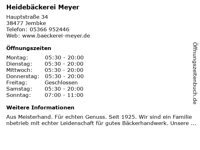 | Öffnungszeiten Heidebäckerei Meyer in Jembke anzeigen | |