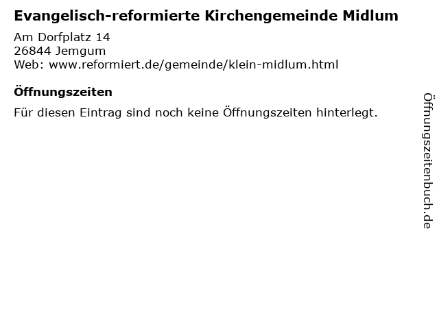 | Öffnungszeiten Evangelisch-reformierte Kirchengemeinde Midlum in Jemgum anzeigen | |