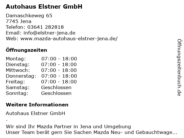| Öffnungszeiten Autohaus Elstner GmbH in Jena anzeigen | |