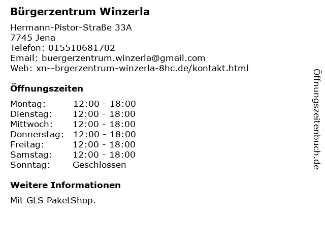 | Öffnungszeiten Bürgerzentrum Winzerla in Jena anzeigen | |
