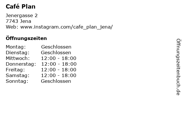 | Öffnungszeiten Café Plan in Jena anzeigen | |