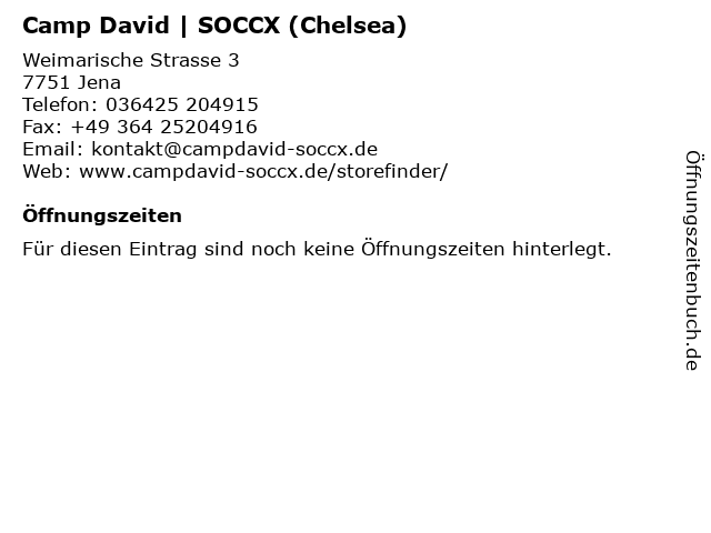 | Öffnungszeiten Camp David | SOCCX (Chelsea) in Jena anzeigen | |