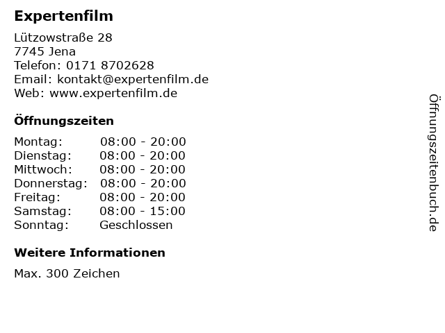 | Öffnungszeiten Expertenfilm in Jena anzeigen | |