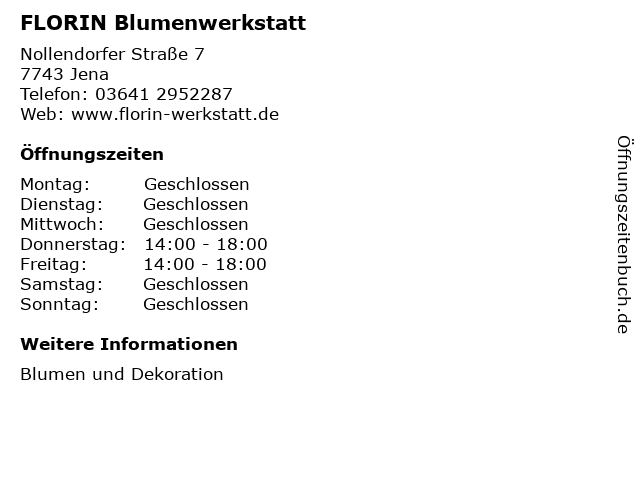 | Öffnungszeiten FLORIN Blumenwerkstatt in Jena anzeigen | |