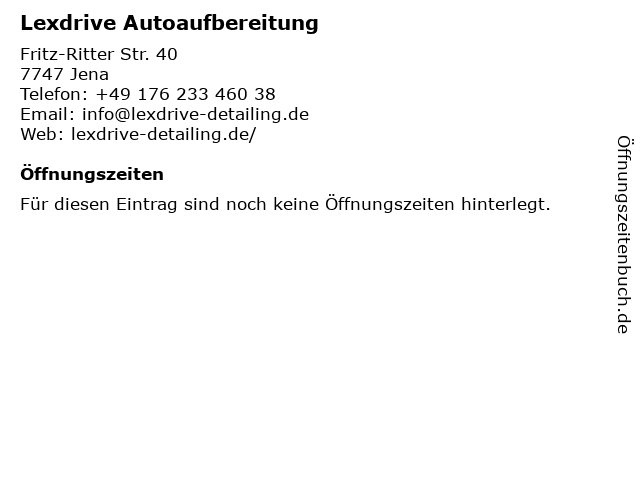 | Öffnungszeiten Lexdrive Autoaufbereitung in Jena anzeigen | |
