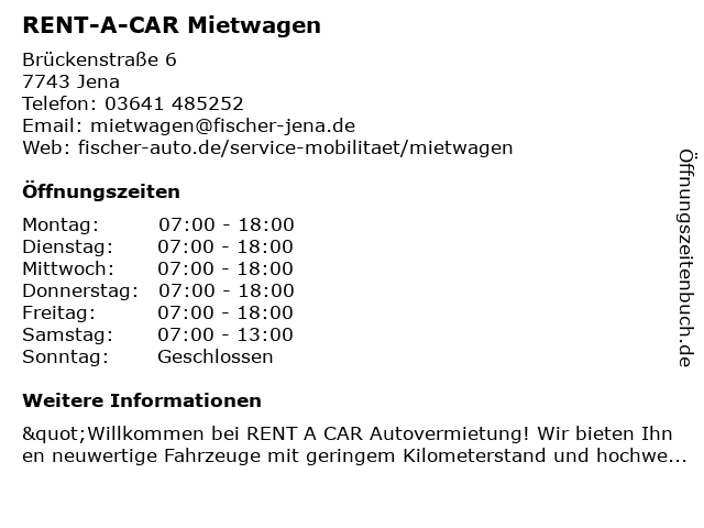 | Öffnungszeiten RENT-A-CAR Mietwagen in Jena anzeigen | |