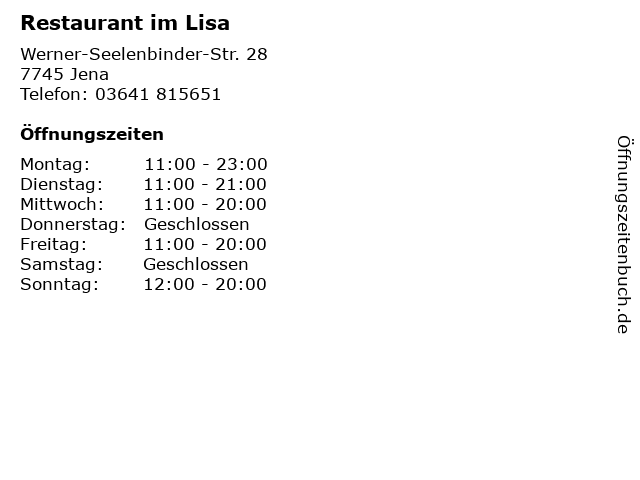 | Öffnungszeiten Restaurant im Lisa in Jena anzeigen | |