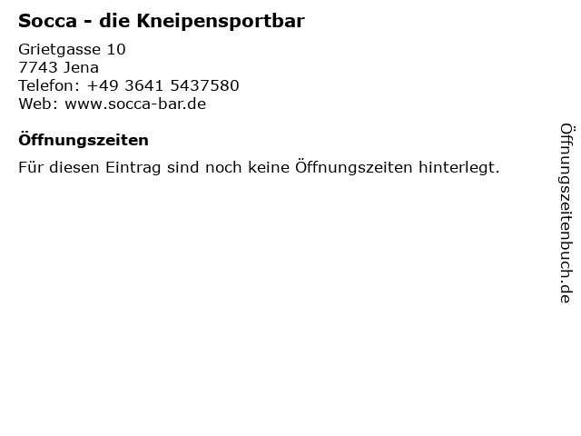 | Öffnungszeiten Socca - die Kneipensportbar in Jena anzeigen | |