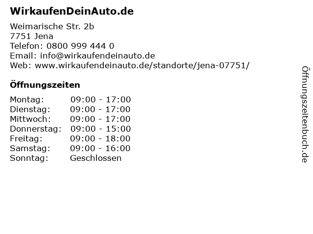 | Öffnungszeiten WirkaufenDeinAuto.de in Jena anzeigen | |