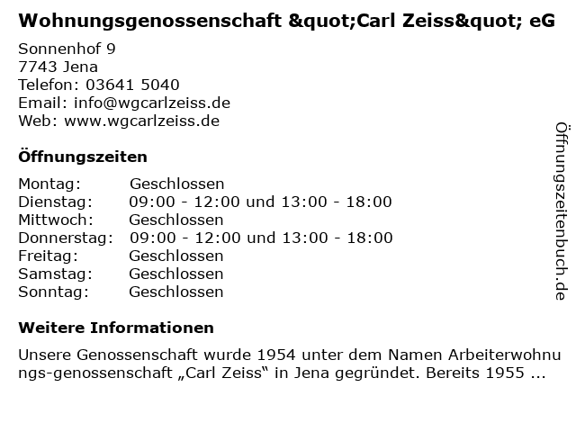 1 Wohnungsgenossenschaft 'Carl Zeiss e.G.' - Geschäftsstelle (Entfernung: 0,03 km) Sonnenhof 9, 07743 Jena 2 Wohnungsgesellschaft Carl-Zeiss-Siedlung GmbH - Sekretariat/Rechnungswesen (Entfernung: 0,44 km) Ernst-Haeckel-Platz 2, 07745 Jena 6 |