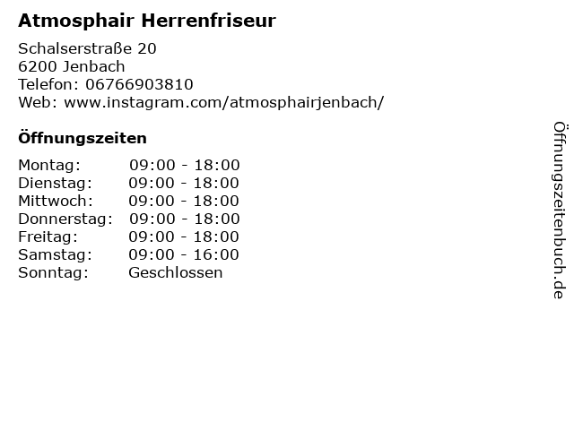 | Öffnungszeiten Atmosphair Herrenfriseur in Jenbach anzeigen | |