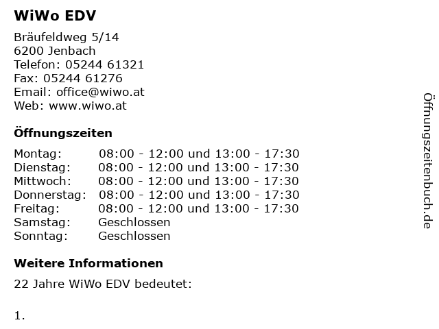 | Öffnungszeiten WiWo EDV in Jenbach anzeigen | |