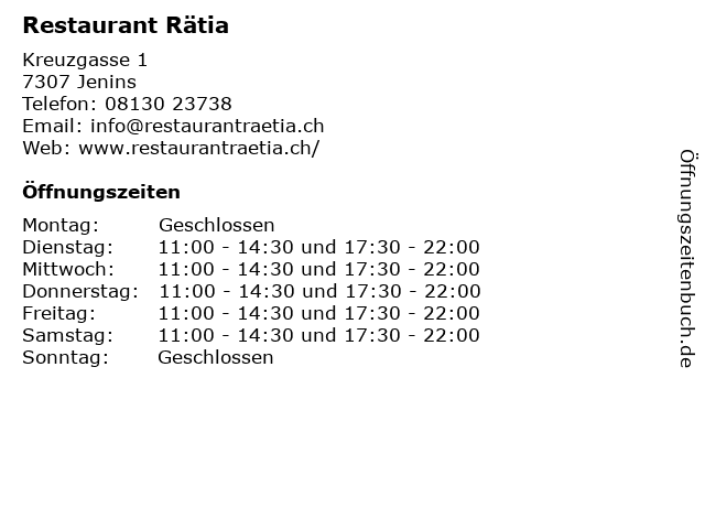| Öffnungszeiten Restaurant Rätia in Jenins anzeigen | |