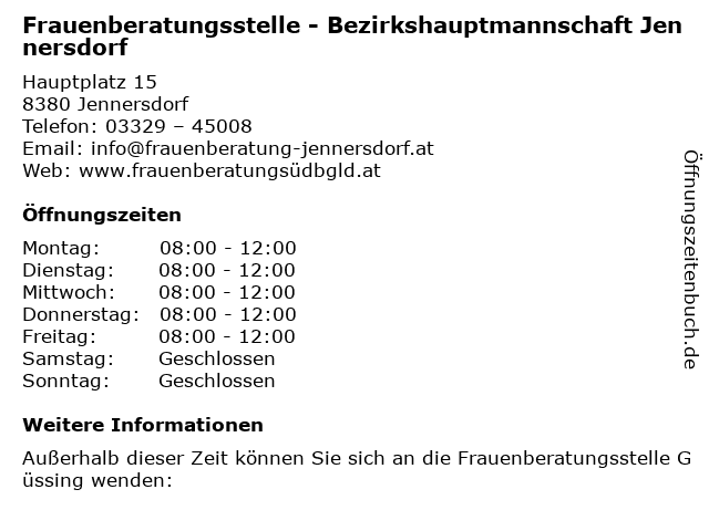 Branchen & Suchbegriffe zu Frauenberatungsstelle - Bezirkshauptmannschaft Jennersdorf:beratungsstelle, bezirkshauptmannschaft, dienstleistung, frauenberatungsstelle, jennersdorf |