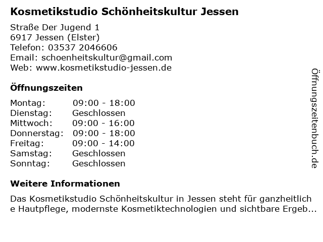 3 Sieglinde Naumann Kosmetikstudio (Entfernung: 10,23 km) Großkorgaer Landstr. 1, 06917 Jessen (Elster) 4 Kosmetikstudio, Nicole Bischoff (Entfernung: 13,98 km) Wittenberger Chaussee 46, 06905 Bad Schmiedeberg 6 |