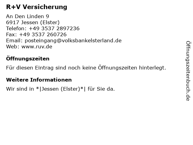 | Öffnungszeiten R+V Versicherung in Jessen (Elster) anzeigen | |