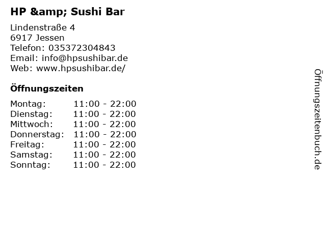| Öffnungszeiten HP & Sushi Bar in Jessen anzeigen | |