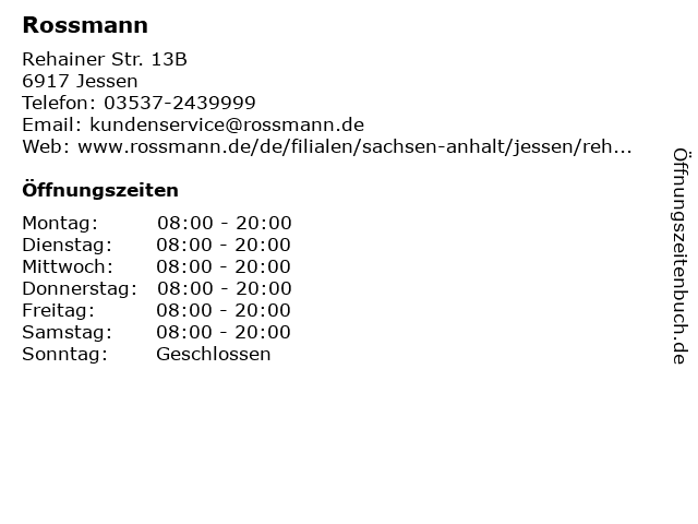 | Öffnungszeiten Rossmann in Jessen anzeigen | |
