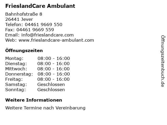| Öffnungszeiten FrieslandCare Ambulant in Jever anzeigen | |