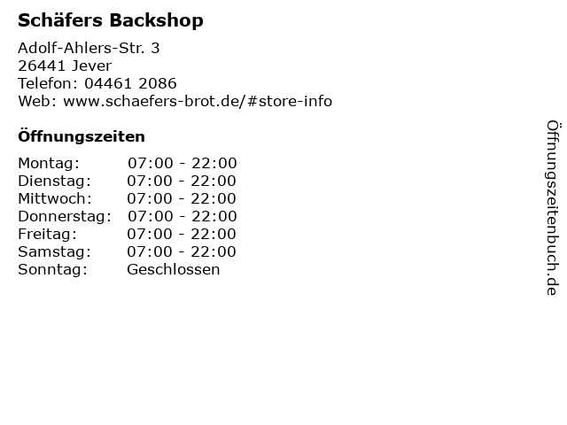 | Öffnungszeiten Schäfers Backshop in Jever anzeigen | |