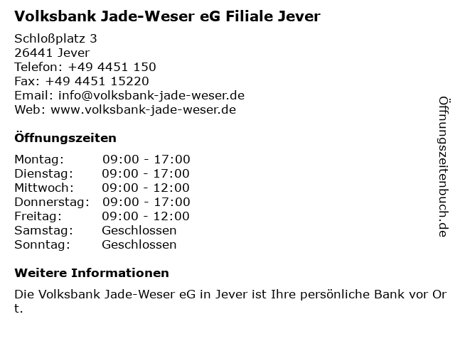 Branchen & Suchbegriffe zu Volksbank Jade-Weser eG Filiale Jever:altersvorsorge, bank, baufinanzierung, eg, geldanlage, geldautomat, girokonto, immobilien, jade, jever, kredit, kreditkarte, versicherung, volksbank, weser |