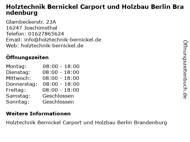 1 Holztechnik Bernickel Carport und Holzbau Berlin Brandenburg (Entfernung: 0,00 km) Glambeckerstr. 23A, 16247 Joachimsthal 3 Sven Sternberg Knorrenstöter Holzbau- u. Substanzerhaltung (Entfernung: 15,62 km) Dorfstr. 14, 17268 Temmen-Ringenwalde 4 Holzbau&Innenausbau Denny Gerner Zimmerei (Entfernung: 17,02 km) Brodowiner Dorfstr. 21, 16230 Chorin 6 |