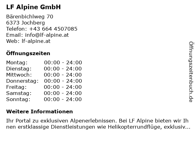 | Öffnungszeiten LF Alpine GmbH in Jochberg anzeigen | |