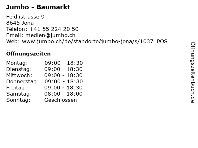 | Öffnungszeiten Jumbo - Baumarkt in Jona anzeigen | |