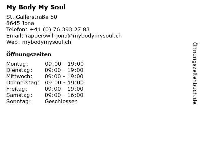 | Öffnungszeiten My Body My Soul in Jona anzeigen | |