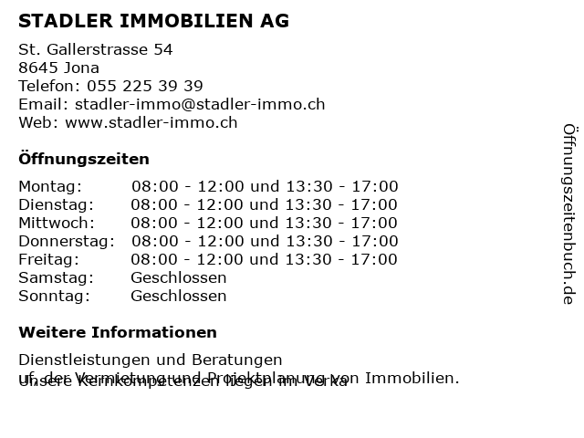 | Öffnungszeiten STADLER IMMOBILIEN AG in Jona anzeigen | |