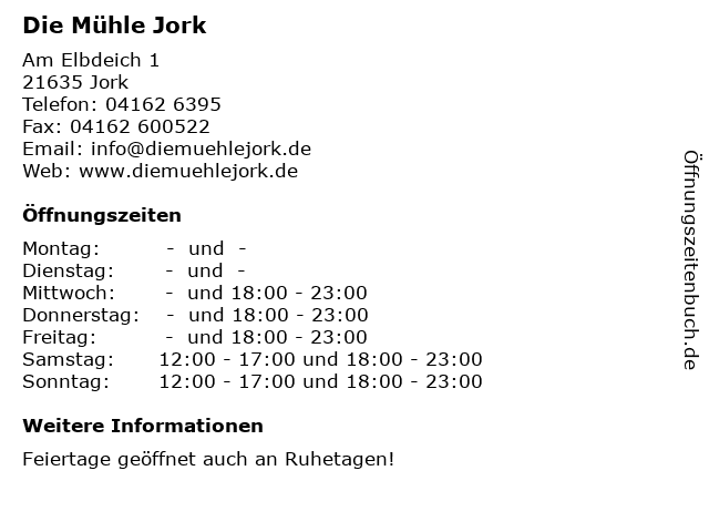 | Öffnungszeiten Die Mühle Jork in Jork anzeigen | |