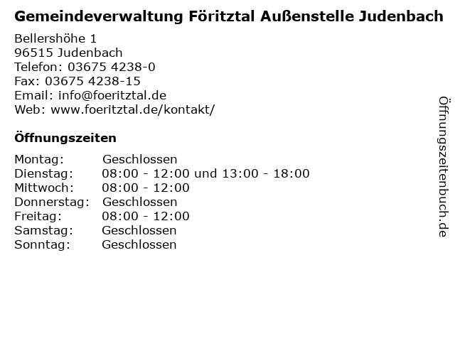 Branchen & Suchbegriffe zu Gemeindeverwaltung Föritztal Außenstelle Judenbach:außenstelle, behörden, föritztal, gemeindeamt, gemeindeverwaltung, gemeindeverwaltungen, gemeindeämter, judenbach, zentralen, ämter |