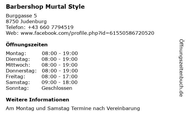 | Öffnungszeiten Barbershop Murtal Style in Judenburg anzeigen | |