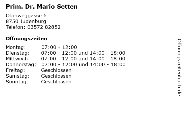 | Öffnungszeiten Prim. Dr. Mario Setten in Judenburg anzeigen | |