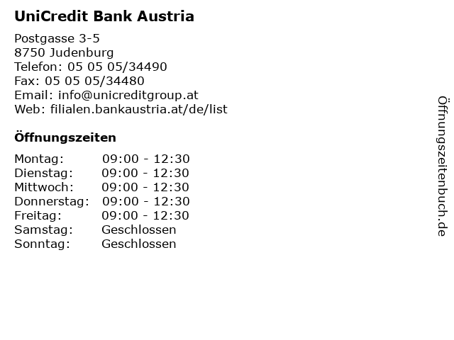 | Öffnungszeiten UniCredit Bank Austria in Judenburg anzeigen | |