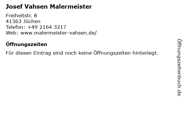 | Öffnungszeiten Josef Vahsen Malermeister in Jüchen anzeigen | |