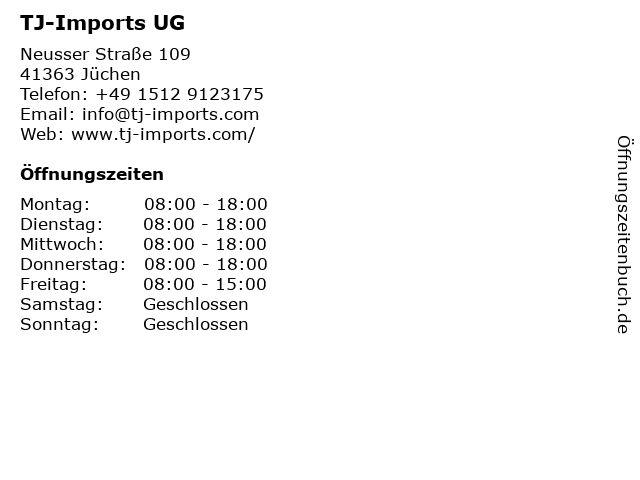 | Öffnungszeiten TJ-Imports UG in Jüchen anzeigen | |