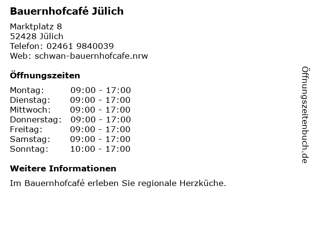 | Öffnungszeiten Bauernhofcafé Jülich in Jülich anzeigen | |