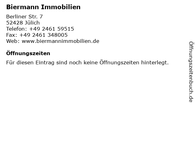 | Öffnungszeiten Biermann Immobilien in Jülich anzeigen | |