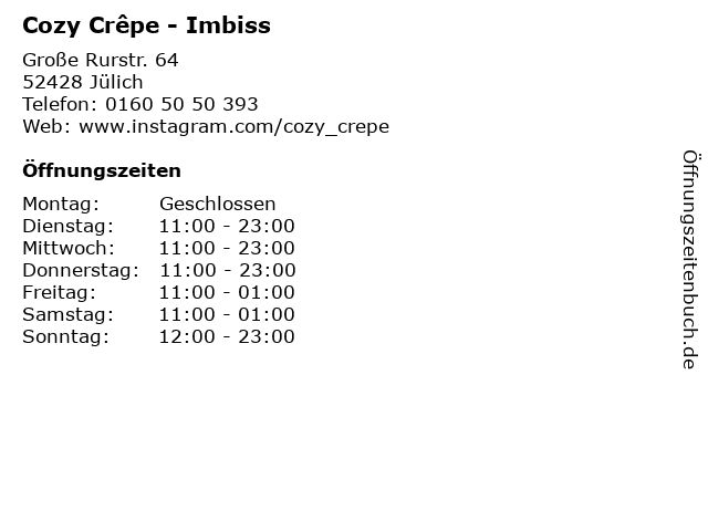 | Öffnungszeiten Cozy Crêpe - Imbiss in Jülich anzeigen | |