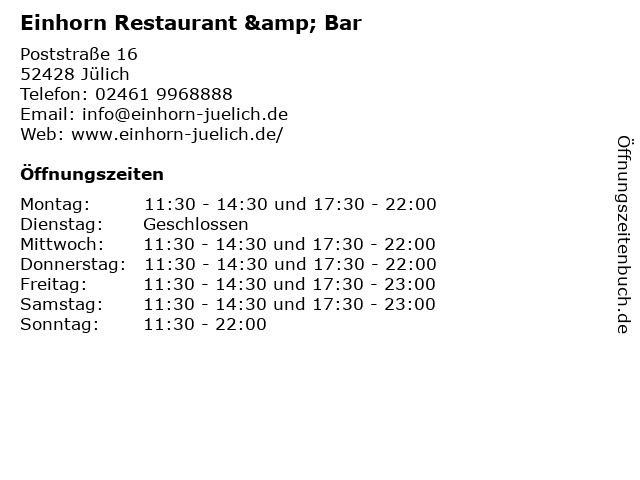 | Öffnungszeiten Einhorn Restaurant & Bar in Jülich anzeigen | |