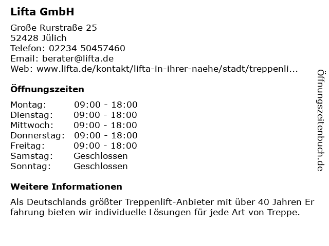 | Öffnungszeiten Lifta GmbH in Jülich anzeigen | |