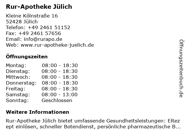| Öffnungszeiten Rur-Apotheke Jülich in Jülich anzeigen | |