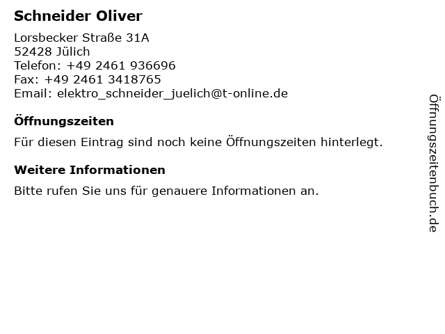 | Öffnungszeiten Schneider Oliver in Jülich anzeigen | |