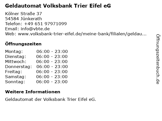 5 Volksbank Trier Eifel eG, Servicepoint Jünkerath (Entfernung: 0,00 km) Kölner Straße 37, 54584 Jünkerath 6 |