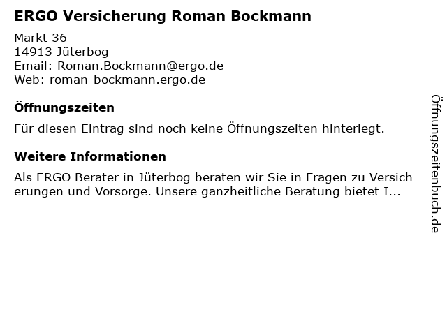 | Öffnungszeiten ERGO Versicherung Roman Bockmann in Jüterbog anzeigen | |