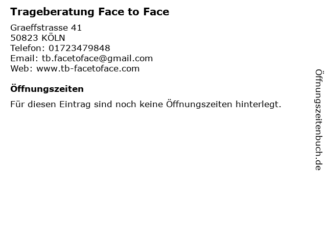 | Öffnungszeiten Trageberatung Face to Face in KÖLN anzeigen | |