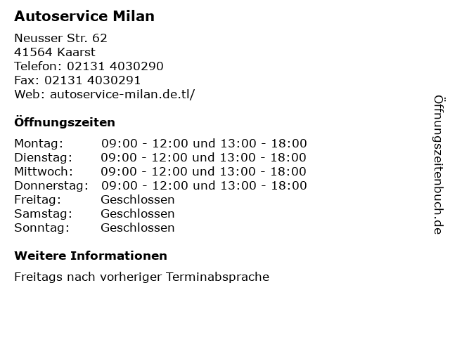 | Öffnungszeiten Autoservice Milan in Kaarst anzeigen | |