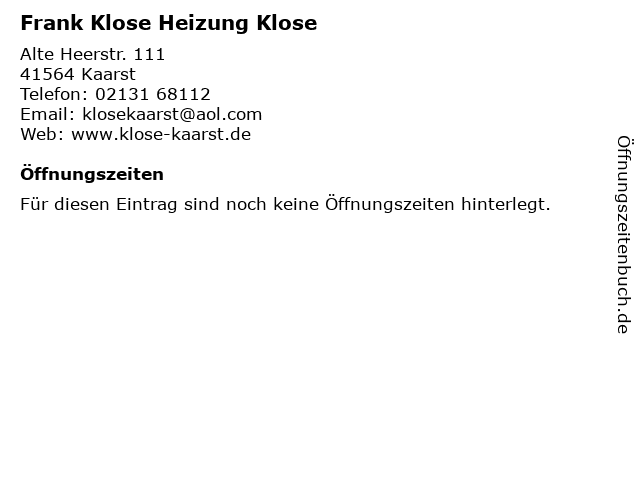 | Öffnungszeiten Frank Klose Heizung Klose in Kaarst anzeigen | |