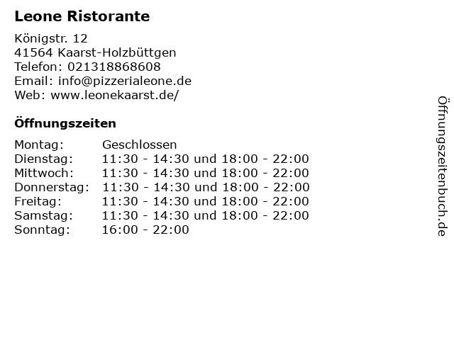 Öffnungszeiten Leone Ristorante in Kaarst-Holzbüttgen anzeigen | |